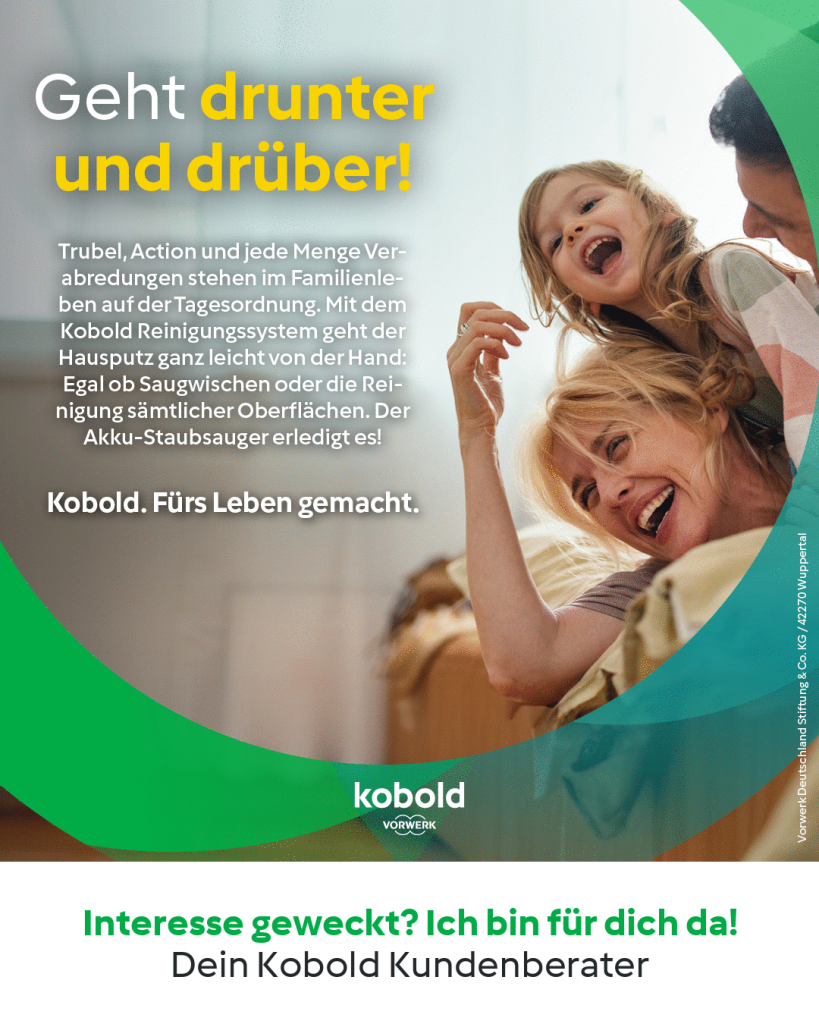 Die Kobold-Produkte aus dem Hause Vorwerk stehen für erstklassige Reinigungsleistung, durchdachte Technik und langlebige Qualität. Sie machen den Haushalt nicht nur effizienter, sondern auch spürbar angenehmer. Mit innovativen Funktionen und ergonomischem Design erleichtern sie den Alltag und sorgen für ein rundum sauberes Zuhause – ganz ohne großen Aufwand, so dass mehr Zeit für die wirklich wichtigen Dinge im Leben bleibt.
